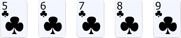 Straight Flush: Lima kartu dengan angka yang berurutan, semuanya memiliki suit yang sama.