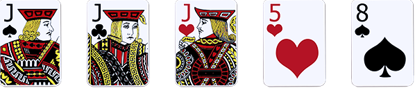 Terdiri dari kombinasi kartu King, Queen atau Jack, dengan simbol kembang bebas (hati, wajik, diamond, kriting)